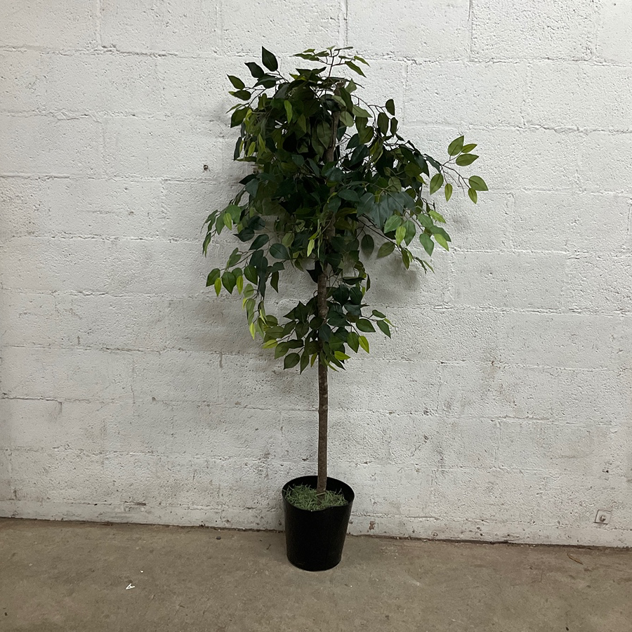 Realistic faux Ficus tree in a black pot. Perfect for indoor decor in homes or offices.