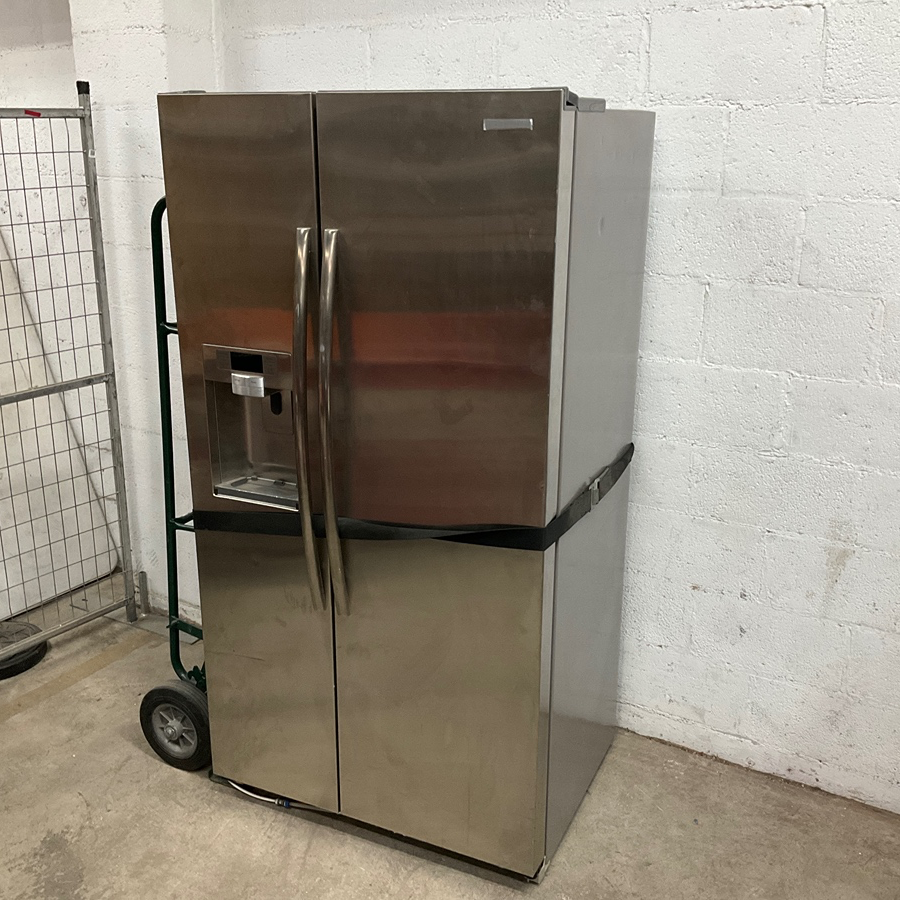 Modern French door refrigerator with built-in water dispenser. Ideal for kitchens, offering spacious storage and sleek design.
