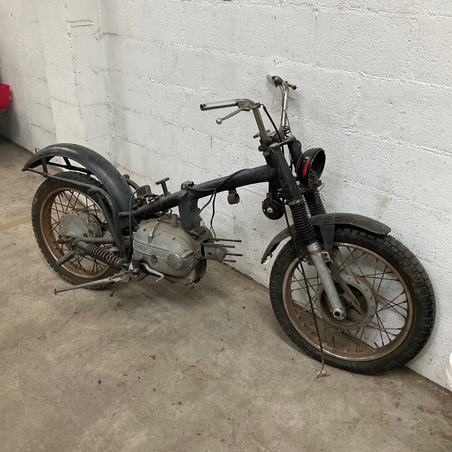 Unfinished vintage motorcycle, perfect for restorations or parts. Metal frame with rust patina.