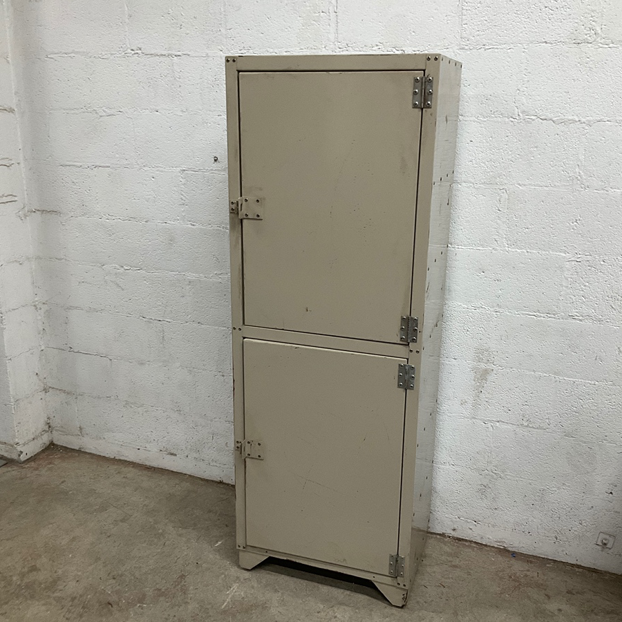 Sturdy vintage metal cabinet with two doors. Ideal for industrial or garage storage. Durable and spacious.