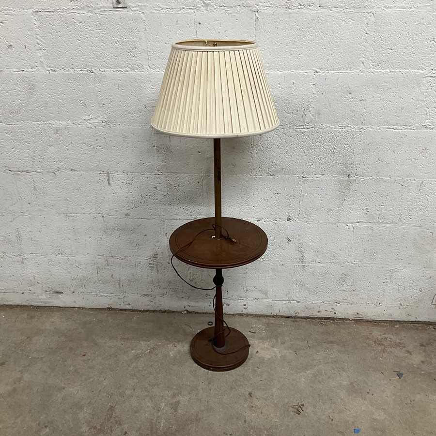 Vintage wood floor lamp with attached round table and pleated cream shade, perfect for living rooms.
