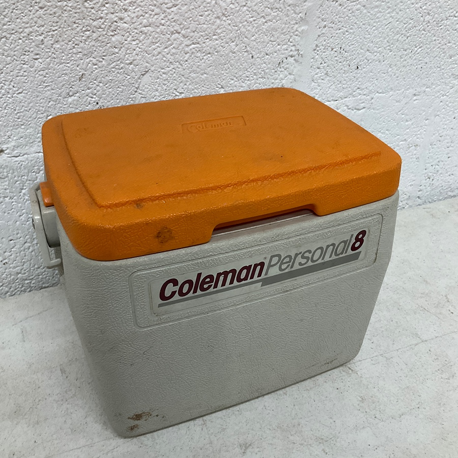 Vintage Coleman Personal 8 cooler in orange and gray. Perfect for outdoor activities. Durable and compact design from the 1980s.