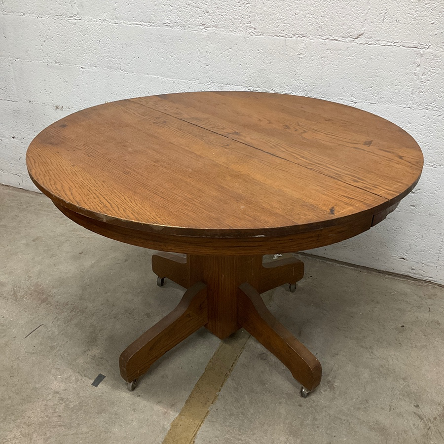 This vintage round wooden dining table features a sturdy pedestal base. Ideal for dining areas or kitchens, it showcases classic craftsmansh...