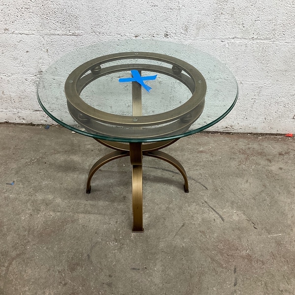 Round glass top table with metal base, suitable for living rooms or offices. Perfect for modern or industrial decor.