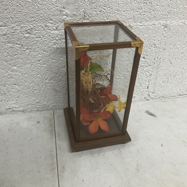 Vintage display box featuring dried flowers and a butterfly, ideal for decorative purposes in any room setting.