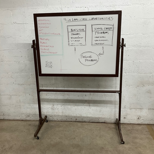 Retro metal-framed whiteboard with wheels for classrooms or offices, ideal for presentations.