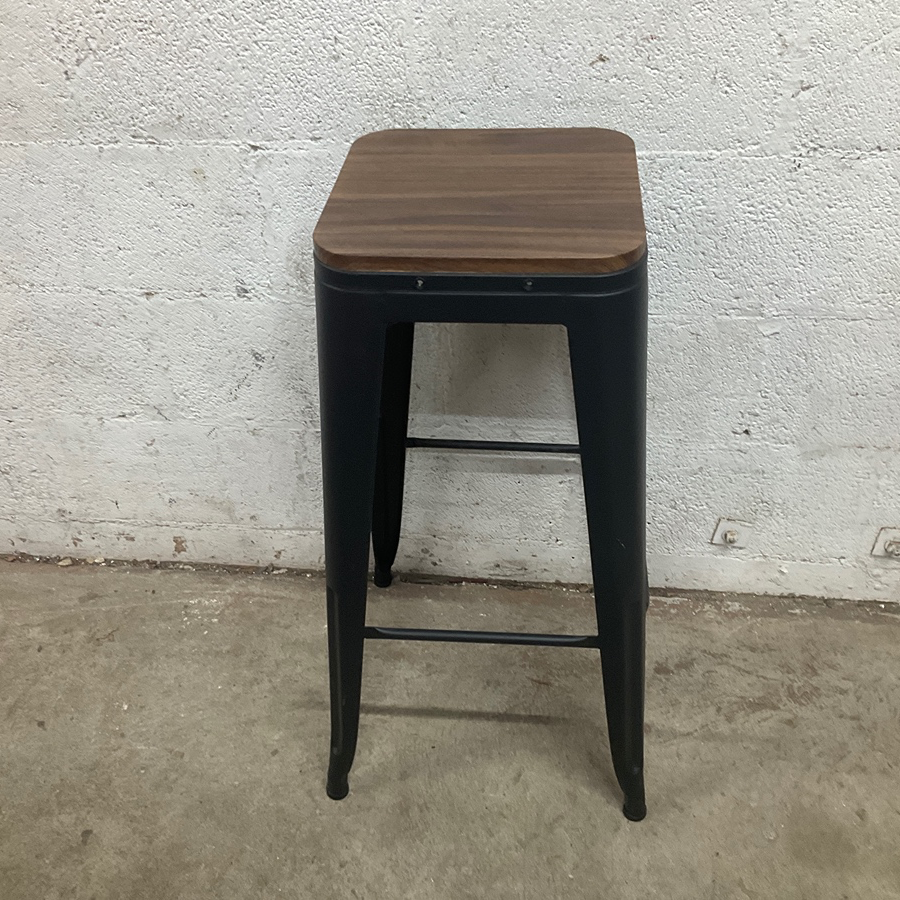 Industrial-style bar stool with a wooden seat. Perfect for kitchens or bars. Features metal legs.