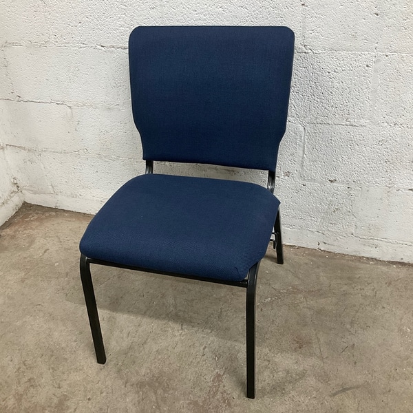 Blue upholstered chair with sturdy metal frame. Great for offices, dining rooms, or study areas.