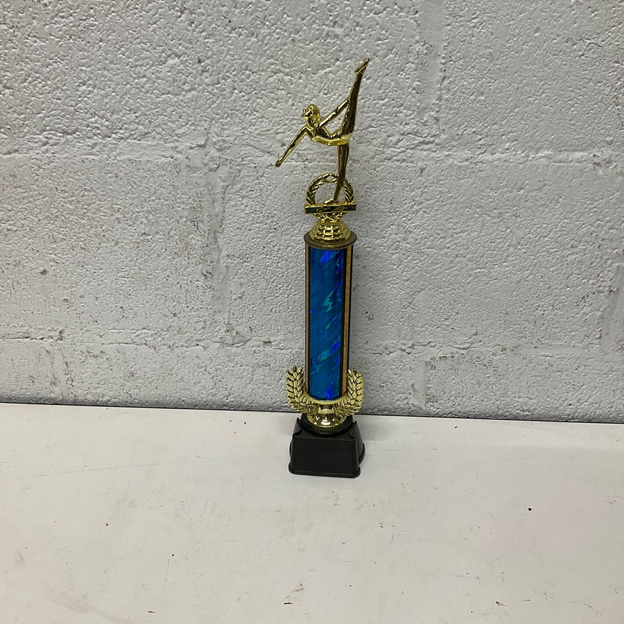 Gold sports figure trophy with a vibrant blue column. Perfect for sports awards or accomplishments.