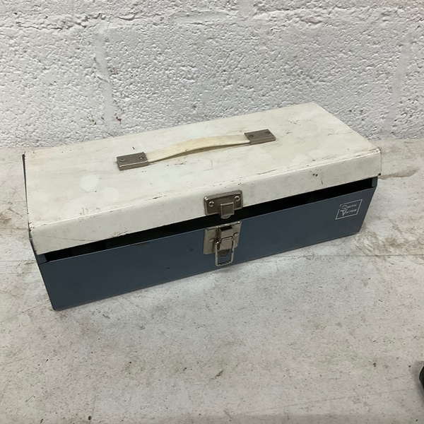 Sturdy vintage metal toolbox with a latch, ideal for storing tools. Great for garages, workshops, and DIY projects.