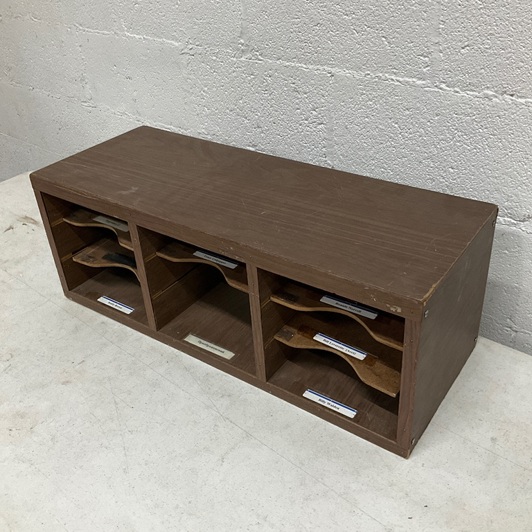 Vintage wooden desk organizer from the 1960s. Ideal for office or study. Features multiple compartments for sorting documents and supplies.