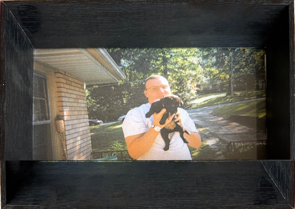 A framed photo of a person holding a puppy outside a brick house, framed in a simple black wooden frame.