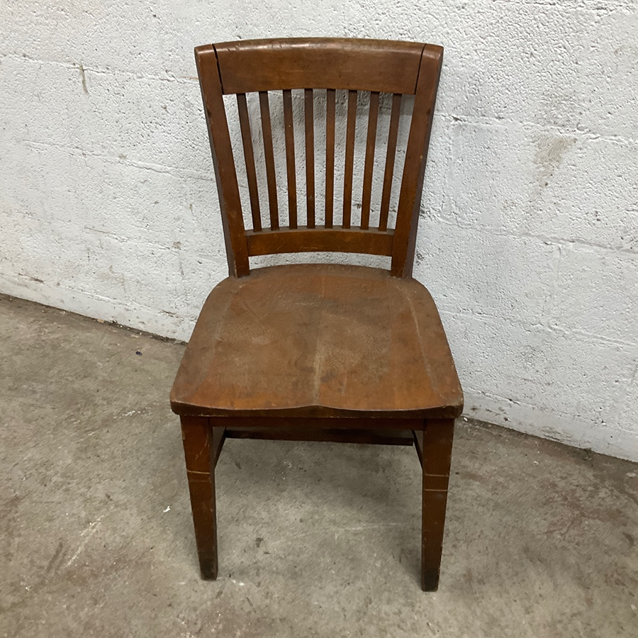 Antique wooden chair with slatted back, ideal for dining rooms or kitchens. Classic and sturdy design.