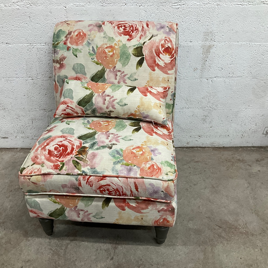 This armless accent chair features a vibrant floral upholstery. Ideal for living rooms or bedrooms, adding a splash of color and comfort.