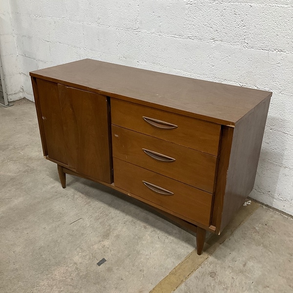 A wooden mid-century modern credenza from the 1960s featuring a cabinet and three drawers. Ideal for living rooms or offices.