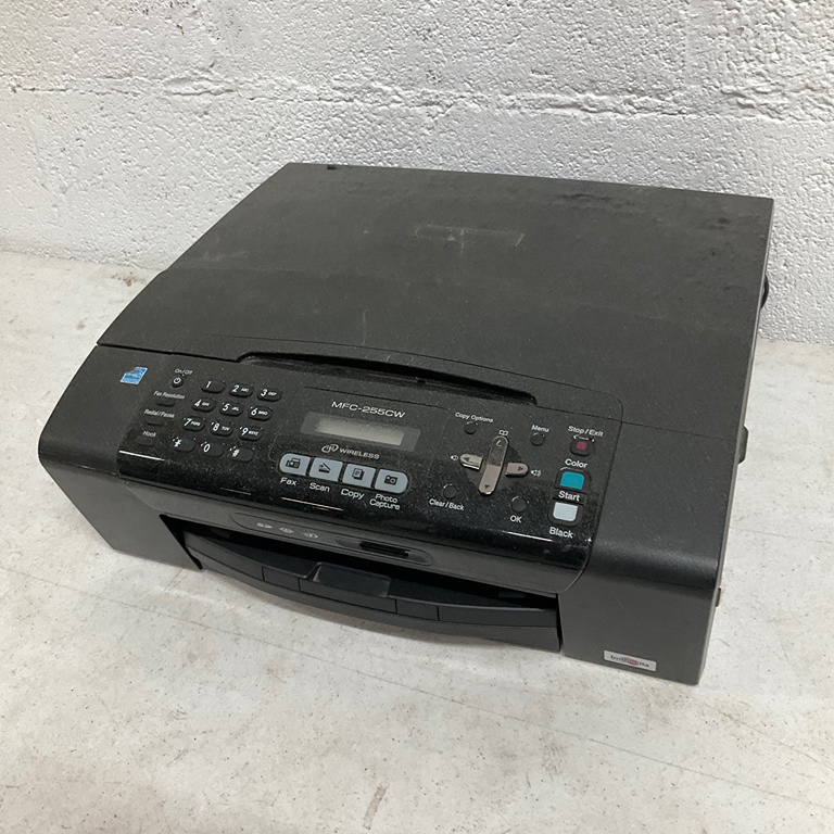 Black multifunction laser printer from the 1990s. Features include print, scan, copy, and fax capabilities. Ideal for office use.