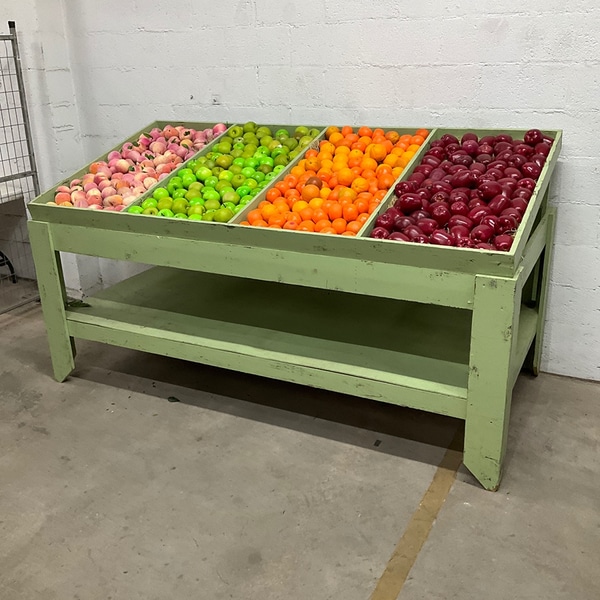 Green wooden table ideal for visual merchandising in stores, especially for fruits or vegetables. Vintage style.