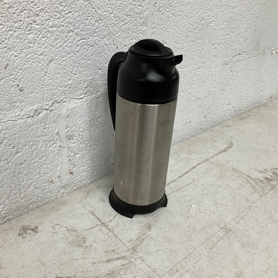Durable stainless steel thermos with black lid and handle. Ideal for preserving beverages hot or cold.
