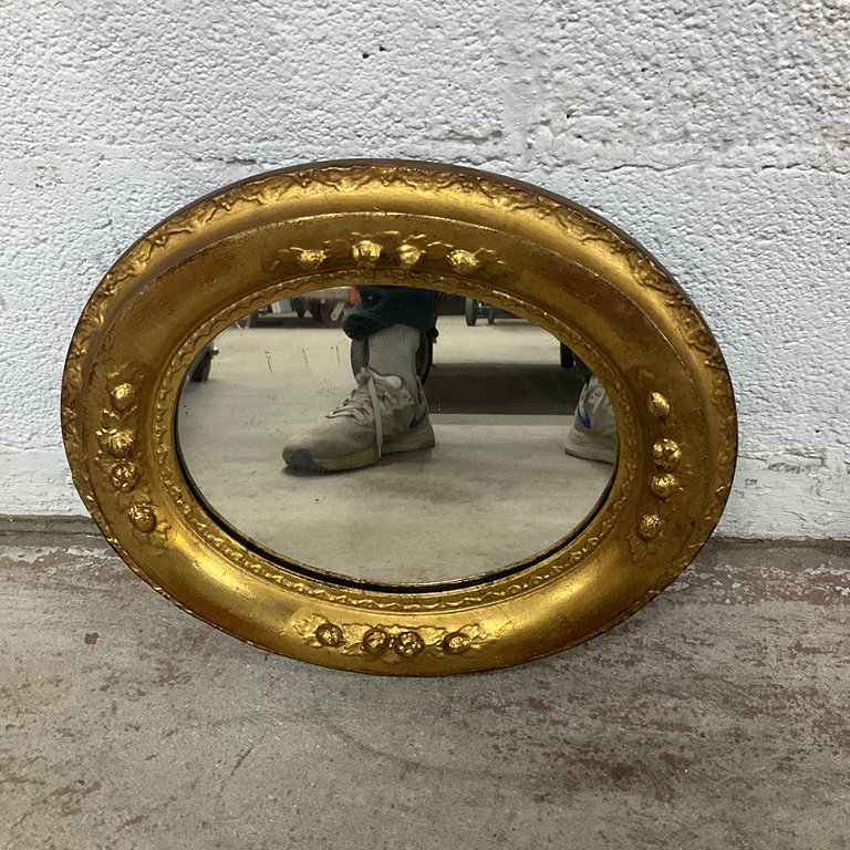 Vintage brass frame mirror perfect for small spaces. Ideal for wall decor in living rooms or hallways.
