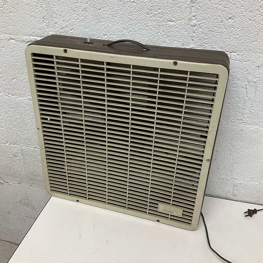 Square vintage box fan with metal grille, ideal for adding a retro touch to any room or space.