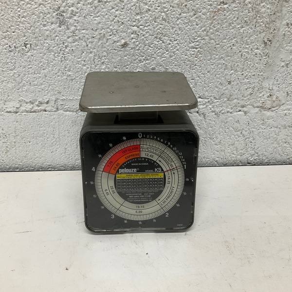 Retro kitchen scale with dial display. Ideal for weighing ingredients. Made of metal and plastic.