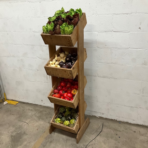 Wooden tiered rack ideal for storing fresh vegetables. Perfect for kitchens, pantries, or stores. Rustic style with four stacked compartment...