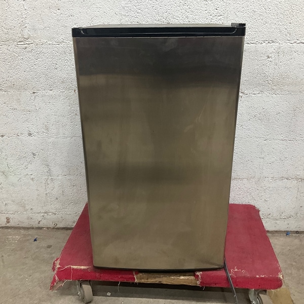 Sleek mini fridge, perfect for small spaces. Modern stainless steel design, ideal for dorms or offices.