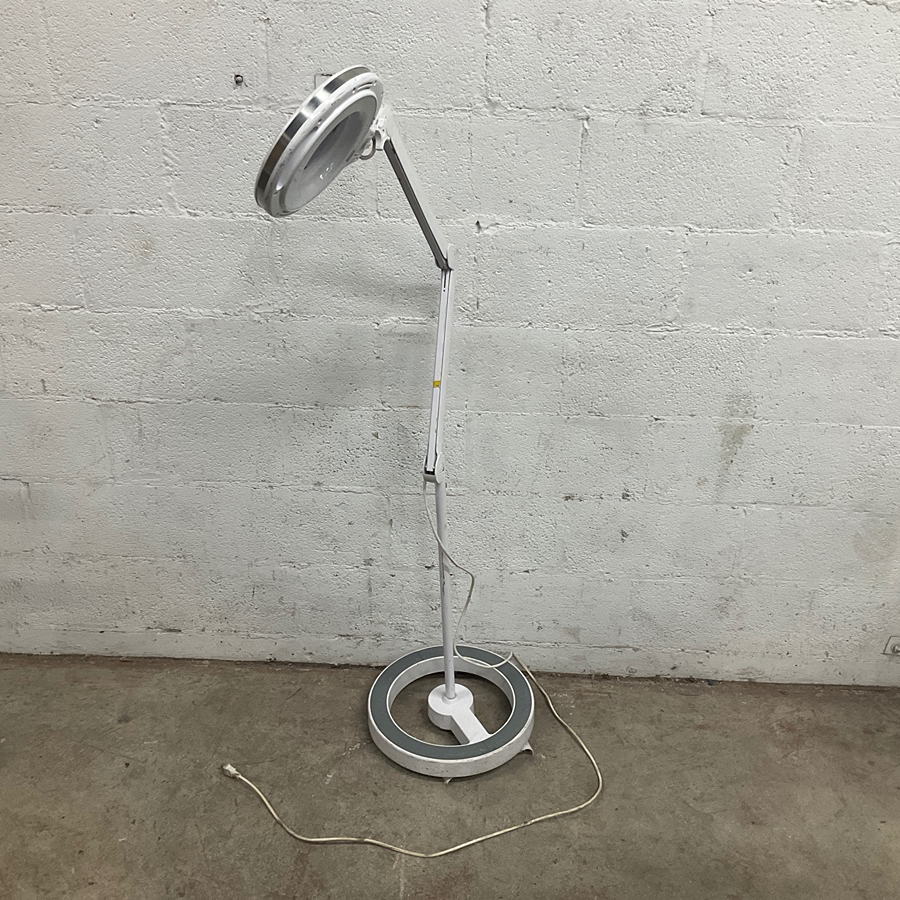 Tall floor lamp with magnification and lighting, great for crafting or detailed work. Useful in workshops or studios.