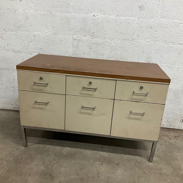 Mid-century metal filing cabinet with wood top. Ideal for office or study storage.