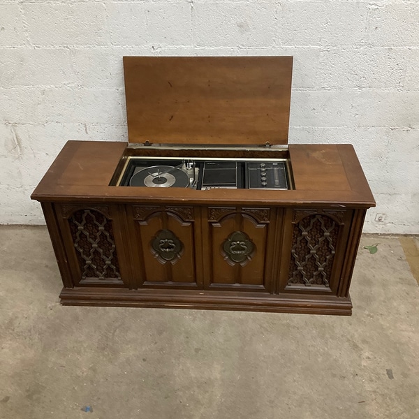1960s wooden cabinet with built-in record player and radio. Perfect for living rooms or retro-themed spaces.