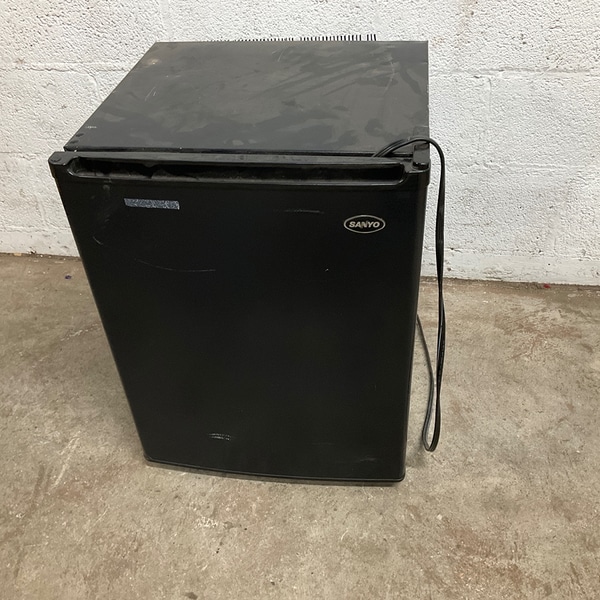 Compact Sanyo mini fridge in black, ideal for dorms or offices. Features a sleek design for convenient storage.