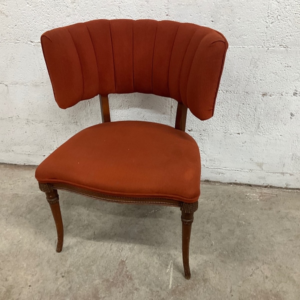 Rust-colored upholstered accent chair with a curved backrest and wooden legs. Ideal for living rooms or bedrooms.