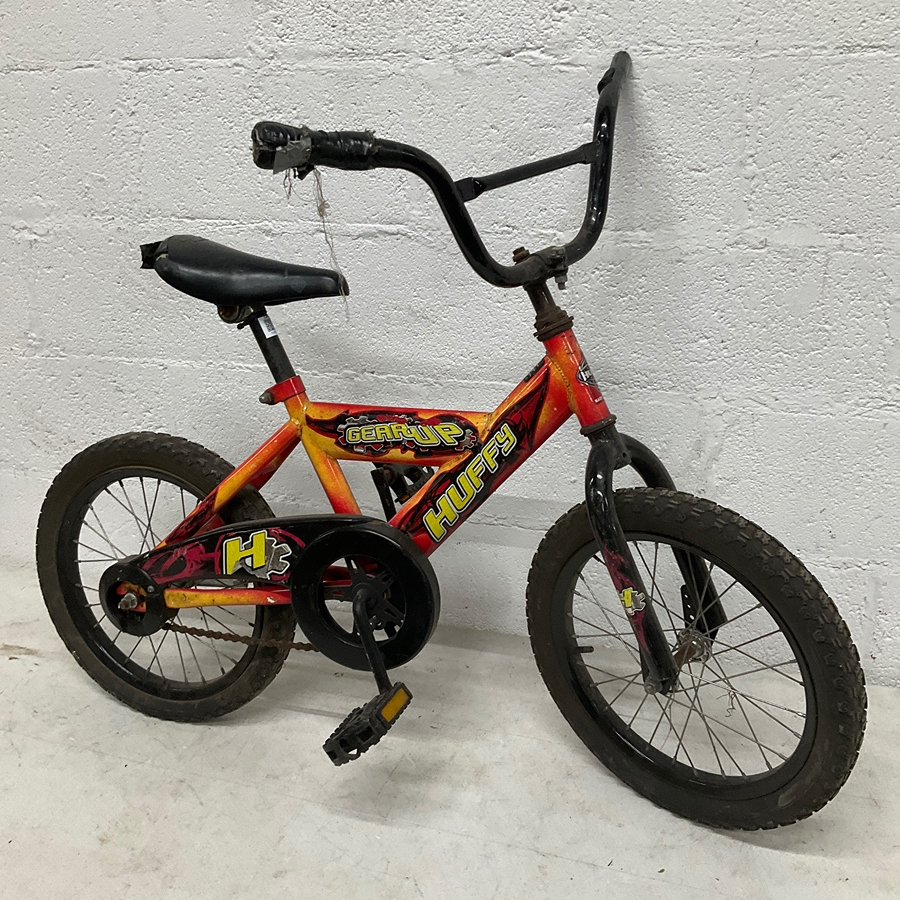 Huffy Gear Up kids bike with a 16-inch frame, sturdy handlebars, and durable wheels. Suitable for outdoor use.
