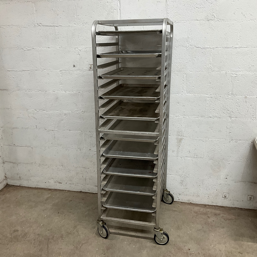 Multipurpose kitchen trolley with multiple shelves for cooling or storage. Ideal for kitchens and bake shops.