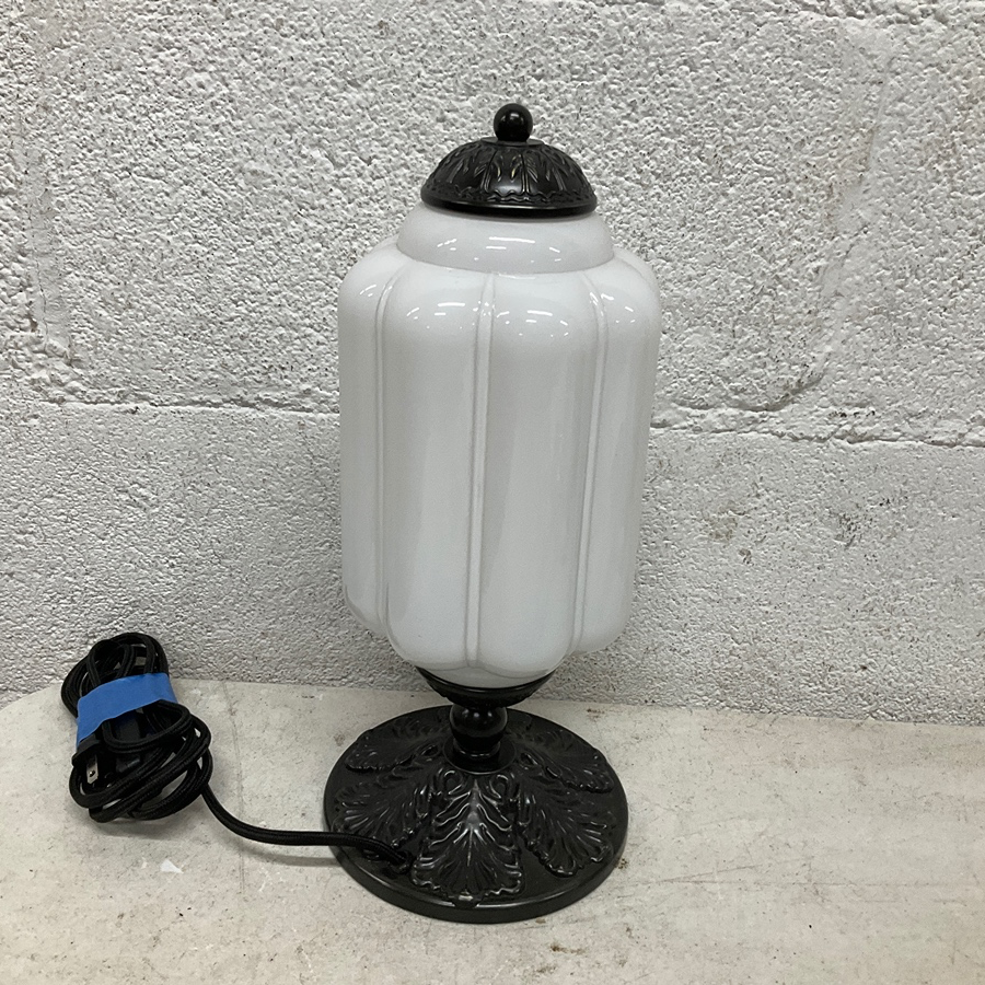 Art Deco style lamp with white glass shade and ornate base. Perfect for living rooms or bedrooms.