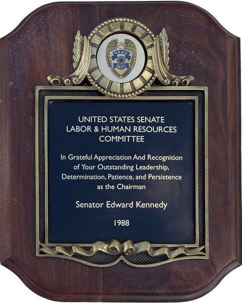 Wooden plaque from 1988 for Senate Labor & Human Resources Committee.
