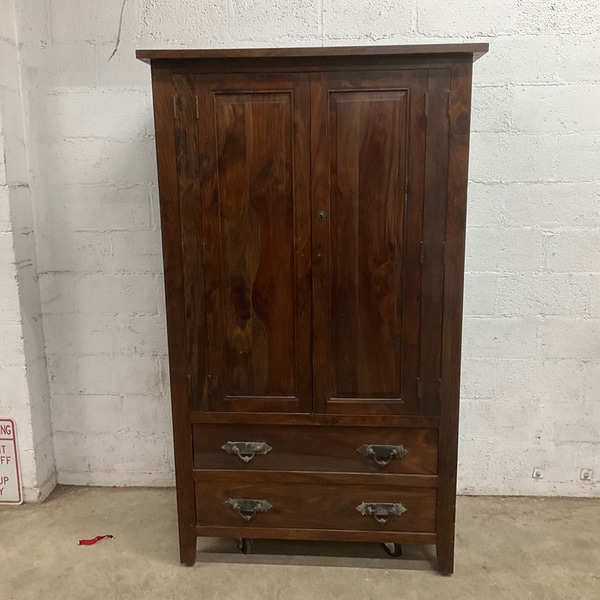 Antique wood wardrobe with two doors and two drawers. Perfect for bedroom storage.