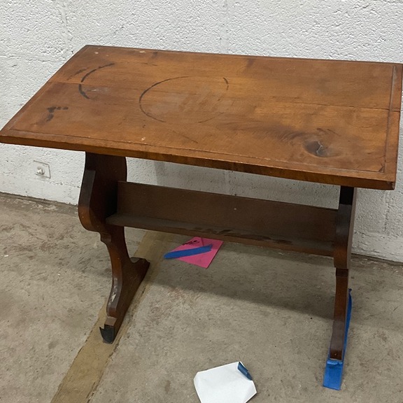 Mid-century wooden side table with lower shelf. Ideal for living rooms or bedrooms. Shows some wear.