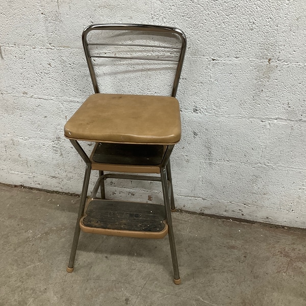 Sturdy 1950s metal step stool with steps and seat. Perfect for kitchens and garages.