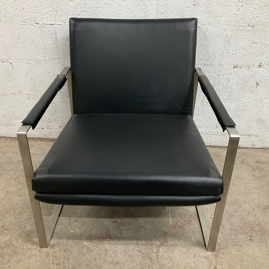 A sleek black leather armchair with a minimalist design featuring metal armrests and legs. Perfect for living rooms or offices.
