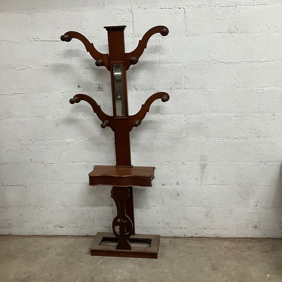 Elegant vintage coat rack with carved details and small mirror, ideal for entryways. Made of wood.