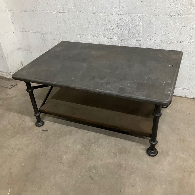 A metal industrial coffee table from the 1980s. Ideal for living rooms. Features a sturdy frame and lower shelf for storage.