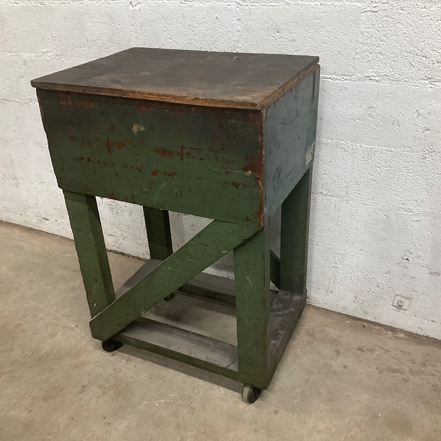 Sturdy wooden stand with a weathered finish, ideal for garage or workshop use. Features a rustic industrial design.