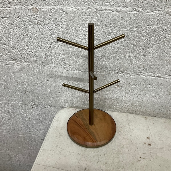 A sleek mug tree stand with a wooden base and metal branches, perfect for kitchens and dining areas.