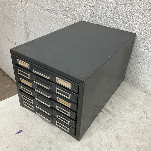 Mid-century industrial metal filing cabinet with multiple drawers, perfect for office or industrial decor.
