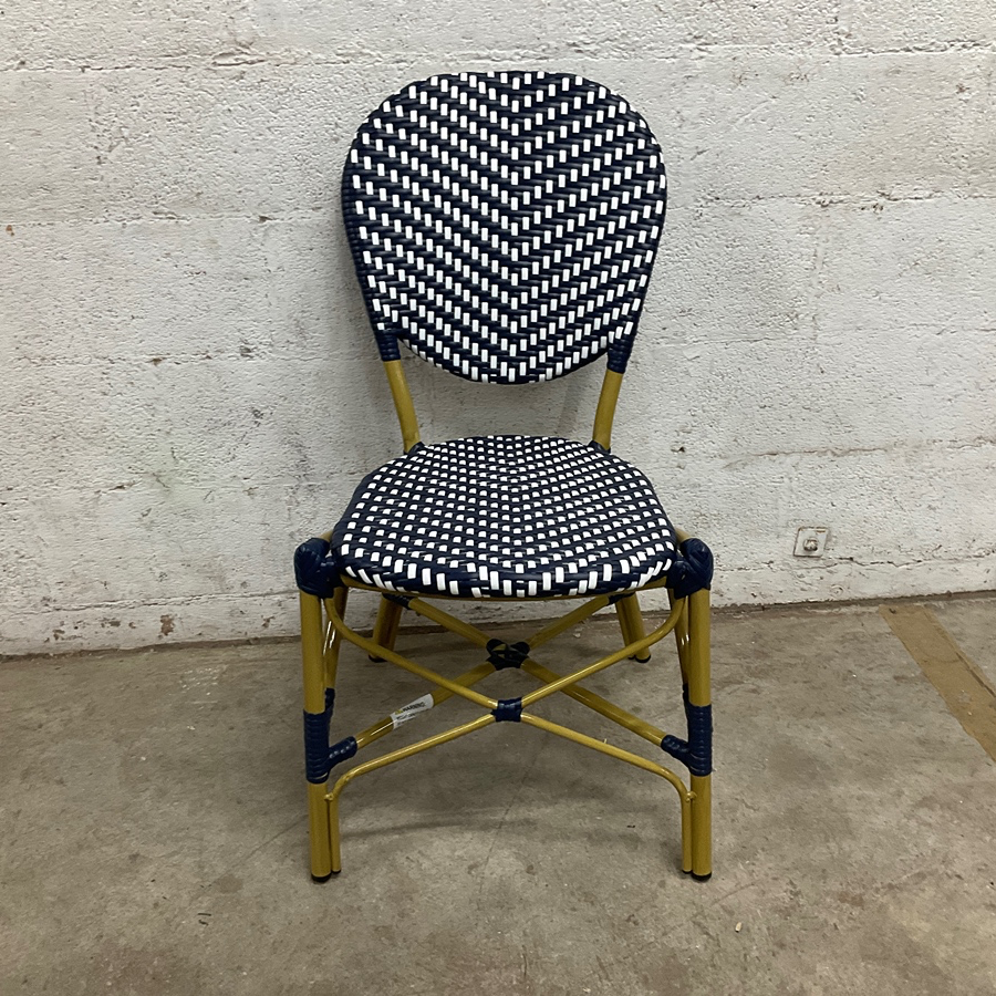 An elegant rattan bistro chair with woven design, ideal for patios and dining areas. Features a classic navy and white pattern.