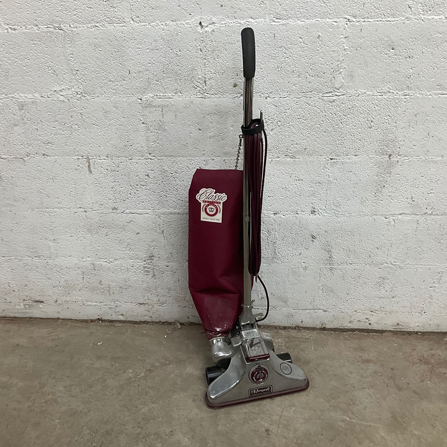 Chrome and burgundy upright vacuum cleaner for vintage decor.