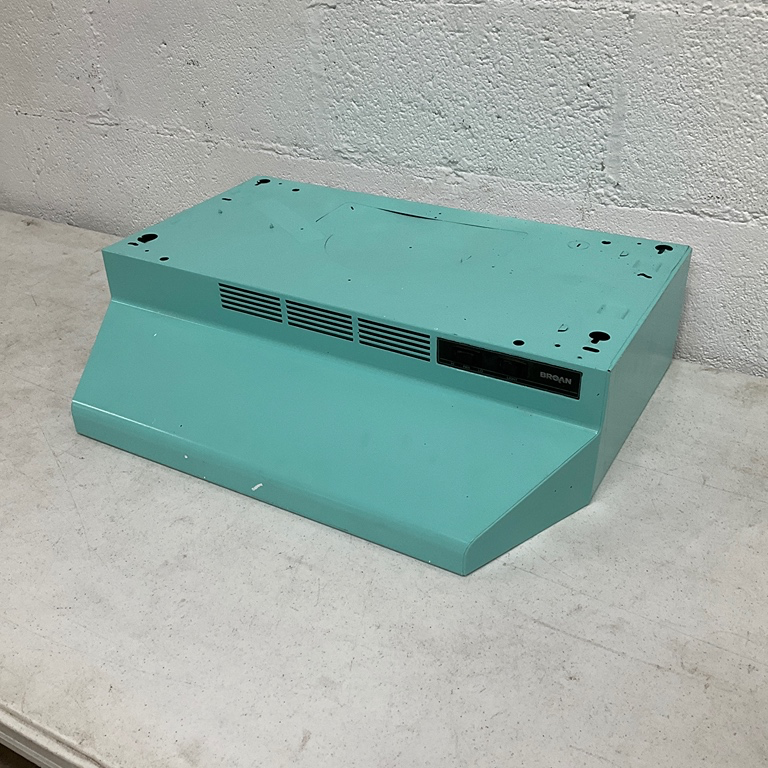Vintage metal range hood in turquoise. Perfect for adding a pop of color to your kitchen. Ideal for home decor enthusiasts.