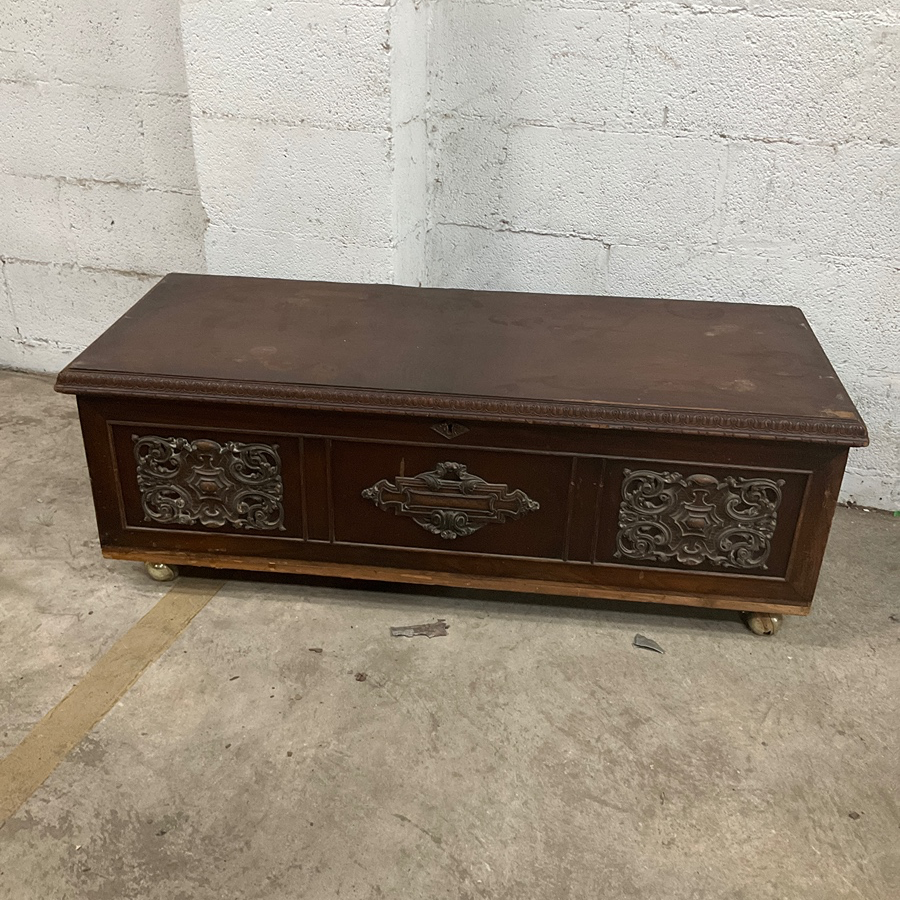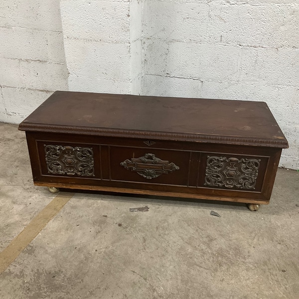 Wooden storage trunk with ornate metal details. Ideal for living rooms or bedrooms.