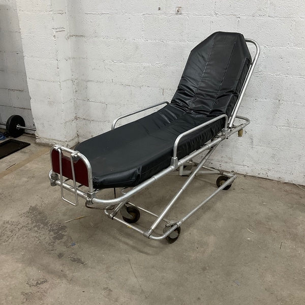 Wheeled metal stretcher with padded surface, ideal for medical or emergency settings. Mid-century design.